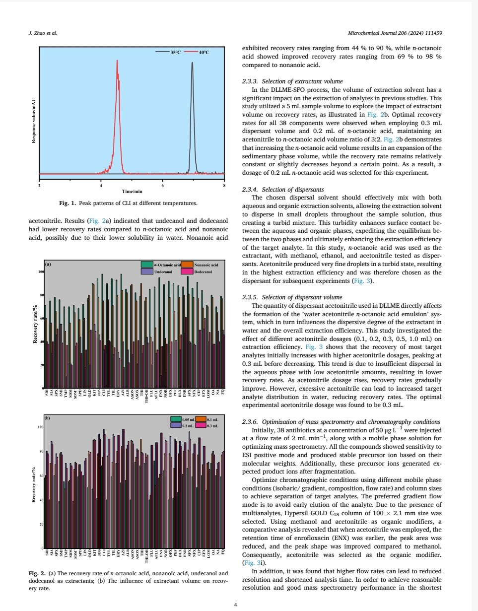 日前,由陜西秦云農產品檢驗檢測股份有限公司科研人員趙娟為第一作者的論文“Organic suspension droplet solid-phase dispersive liquid-liquidmicroextraction ultra-high performance liquid chromatography tandemmass spectrometry determination of antibiotic residues in water samples”在國際權威刊物microchemical journal上發表。